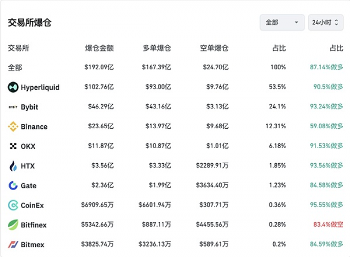 Coinglass 数据显示,截至 11 日 9 时,24 小时爆仓额达到 192 亿美元,爆仓人数达 164 万人,最大单笔爆仓单超 2 亿美元。