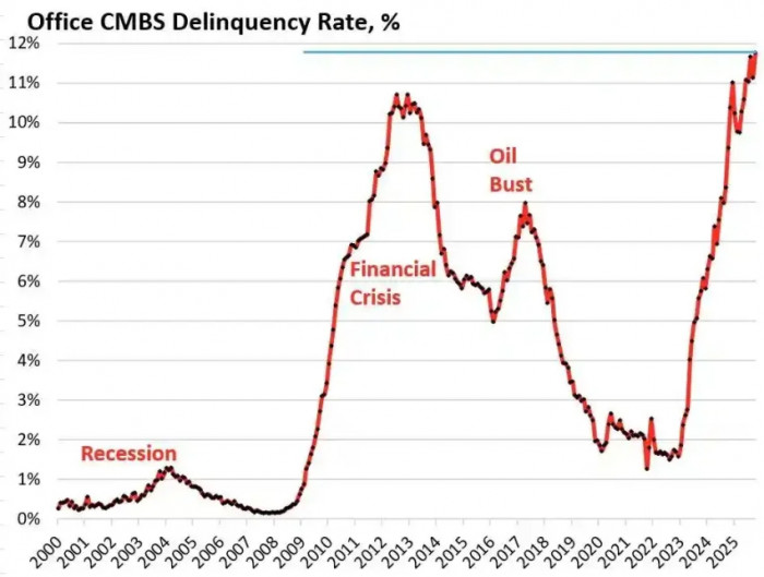 据研究机构 Trepp 的数据显示,美国办公楼 CMBS 商业地产抵押贷款证券化产品的违约率在 2025 年 10 月达到 11.8%,不仅创下历史新高,甚至超过了 2008 年金融危机时 10.3% 的峰值。短短三年内,这个数字从 1.8% 暴涨了近 10 倍。