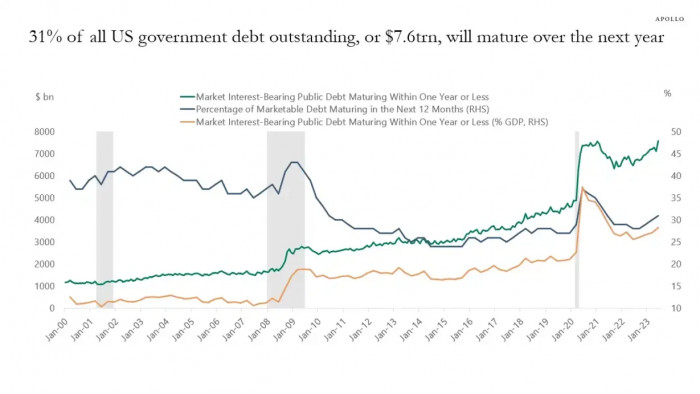 31% 的美国政府债务(约 7 万亿美元)将在未来一年内到期,加上新增债务发行,总规模可能达到 10 万亿美元|图源:Apollo Academy