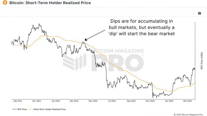 从我们对上一个周期短期持有者实现价格(Short-Term Holder Realized Price)的图表分析中,可以看到这种多次回调的模式。同样清楚的是,这个指标在该阶段中起到了关键的阻力,只有当BTC恢复短期持有者实现价格水平后,才经历了持续的反弹。