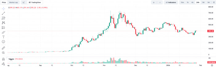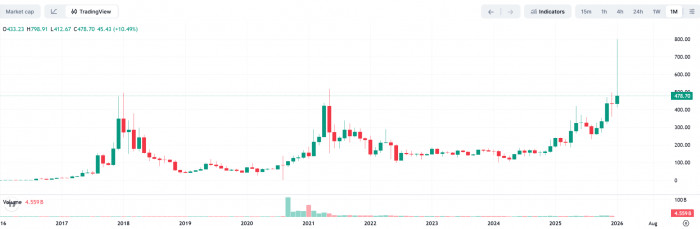 门罗币(XMR)作为隐私币的「老大哥」,走势同样强劲。从 2025 年年末的 300 美元附近,一路狂飙至最高 800 美元,创下历史新高。