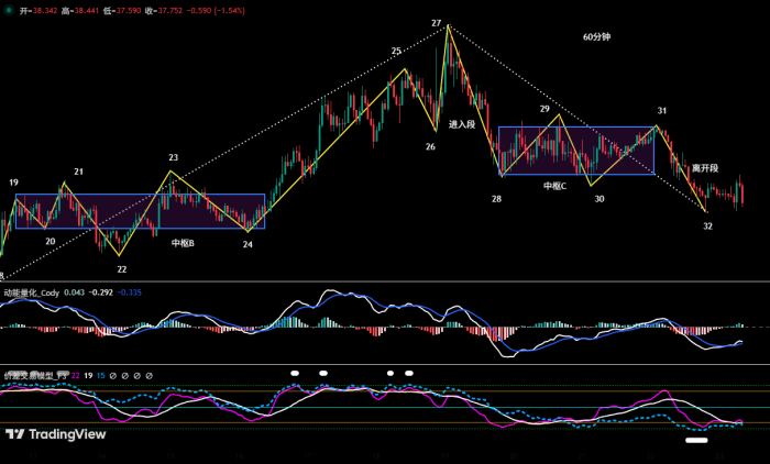 a、如(图一)所示,自端点 24 起,此前构筑的上涨中枢(即中枢 B)已确认构建完毕。随后行情演化出一段由 24-25、25-26、26-27、27-28、28-29、29-30、30-31、31-32 共计 8 段构成的复杂结构。截止分析时,31-32 段正在运行,结构层次较为清晰。