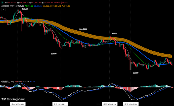 中线策略保持稳健推进。继续持有于 89,000 美元附近(1 月 28 日)建仓的 60%空单,截止上周盘后(收盘价约 67,865 美元)盈利约 23.75%,期间最大盈利达 32.58%,中线仓位整体运行良好。