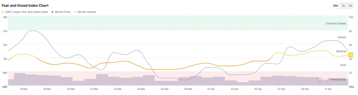 加密市场的大反弹仍遥遥无期。4 月 13 日,BTC 价格徘徊在 71000 美元附近,24 小时内下跌约 2.6%,ETH 表现更弱,下跌 3.63%,报约 2200 美元。比特币市值占比仍在 58.8%,整个加密板块成交量并未显著放大。