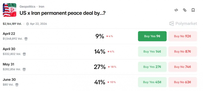 Polymarket 最新数据显示,美国与伊朗达成永久和平协议将在今年 5 月 31 号前的概率为 27%,而在本月 30 号之前的达成协议的概率降至 14%。