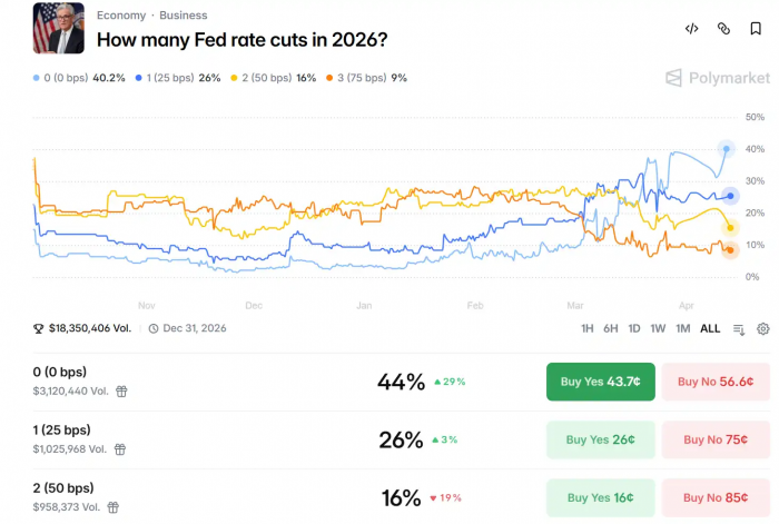 目前 Polymarket 上最新数据显示,市场押注今年美联储降息 1 次 25 个基点的概率仅为 26%,而按兵不动的概率升至 44%。