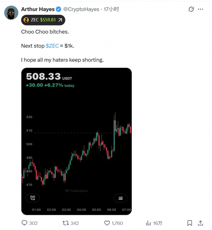 硅谷投资人Naval在10月1日背书ZEC(当时$68),提出"Zcash是针对比特币的保险",一周内价格涨至$150。BitMEX创始人Hayes近期频繁喊单ZEC,引爆散户FOMO情绪。加密KOL Ansem将ZEC置于与BTC同等地位。密集的顶级KOL背书制造了"FOMO"的市场氛围,但是也埋下"喊单出货"的隐患。