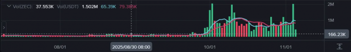 根据CoinMarketCap实时数据,Zcash在2025年10月8日至11月7日期间从$156.21暴涨至$533.92,30天涨幅达到241%(3.41倍),较2021年5月的前高点$319上涨67%,成功实现技术性突破。但值得注意的是,相较于2016年历史峰值$4293,当前价格仍下跌88%,说明ZEC距离真正的重回巅峰仍有巨大距离。