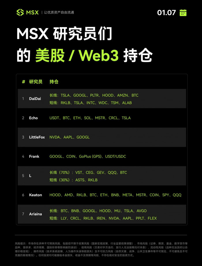 Echo:25 年下半年开始炒美股,就陆陆续续配齐了七姐妹,算是底仓,跟着大盘走。大仓位在 TSLA,我赌的不是车,是马斯克手里那几张牌——能源、AI、机器人;此外还拿了点 MSTR 和 CRCL,算是加密情怀在传统市场的「锚」,放着不动。