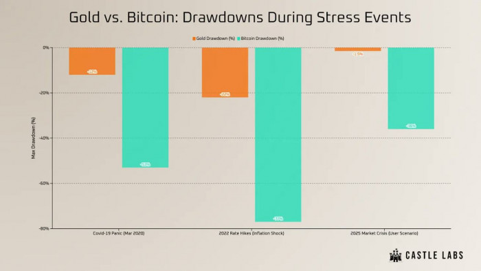 黄金与比特币在三次市场压力事件中的最大跌幅
