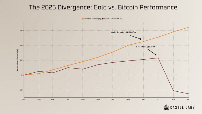 2025 年全年黄金与比特币的「年度累计涨幅」走势对比