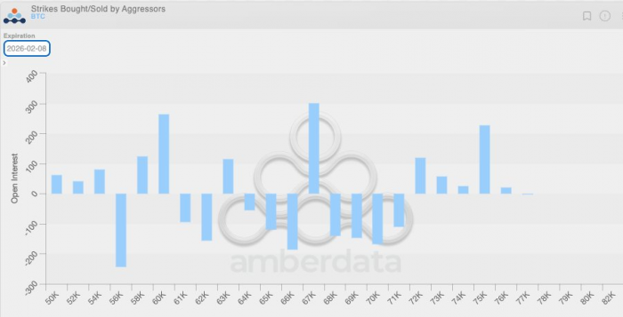 将这一负 Vanna 动态与另一个事实结合起来看,逻辑会更加清晰。由于此前一段时间整体波动率偏低,加密原生市场的客户在过去几周中普遍倾向于买入看跌期权。这意味着,加密交易商本身就处于天然的空 Gamma 状态,而且在定价上低估了未来可能出现的超幅波动。当真正的大幅行情出现时,这种结构性失衡进一步放大了下行压力。下方的仓位分布图也清楚地显示了这一点,在 6.4 万至 7.1 万美元区间,交易商主要集中在看跌期权的空 Gamma 头寸上。