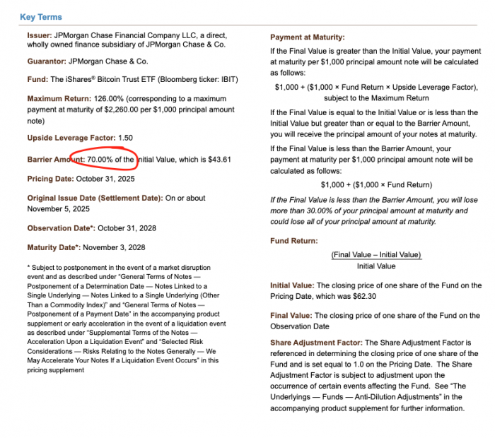 以摩根大通去年 11 月定价的一只票据为例,可以看到其敲入障碍位正好设在 43.6。如果这些票据在 12 月继续发行,而比特币价格又下跌了 10%,那么可以想象,在 38–39 区间将堆积大量敲入障碍,这正是所谓的“风暴眼”。