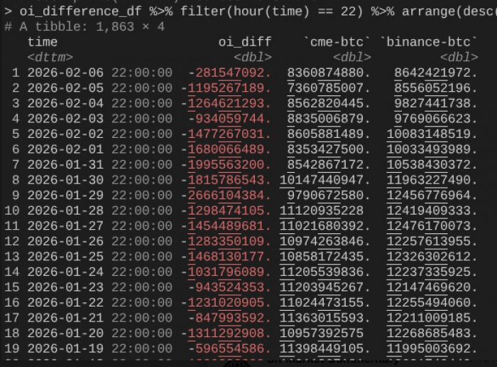 这便将我们带回到 2 月 6 日,当天比特币完成了一次超过 10% 的强势反弹。此时,一个值得注意的现象是,CME 的未平仓合约(OI)扩张速度明显快于币安(同样感谢 @dlawant 将小时级数据对齐至美东时间下午 4 点)。从 2 月 4 日到 5 日,可以清楚看到 CME OI 的明显坍塌,这再次印证了基差交易在 2 月 5 日被大规模平仓的判断;而在 2 月 6 日,这部分头寸可能重新建立,以利用更高的基差水平,从而抵消了资金流出的影响。