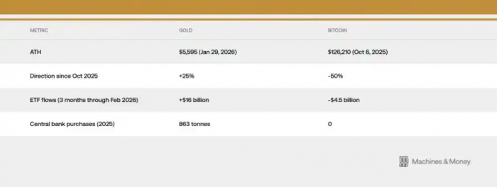 资金流向的巨大差异,是对「数字黄金」论最有力的反驳:当那些大机构和主权基金真的需要避险,来应对比特币本应能保护他们免受伤害的那种宏观环境时,他们用超过三比一的资金比例,选择了黄金。