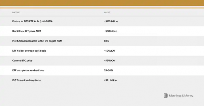 这就形成了一个自我强化的循环:因为机构把它归类为科技股,所以它的资金流向就和科技股同步了;而这种同步反过来又强化了机构对它的科技股定位。根据估算,美国现货比特币 ETF 持有者的平均成本大概在 9 万美元左右,这意味着现在价格跌到 6.4 万美元附近,整个 ETF 里的机构资金都浮亏了 25% 到 30%。这个成本缺口很重要,因为它让原本可能长期持有的机构资金,变成了持续的卖出力量。那些以为买 ETF 能分散风险或者避险的人,现在眼睁睁看着黄金 ETF 在涨,而自己手里的一直在亏。2026 年初以来,我们一直能实时看到这种 ETF 被赎回、然后比特币价格就跌的连锁反应,资金流出的时间之长,创下了 ETF 上市以来的纪录。光是贝莱德的 IBIT 一只基金,在最近五周就流出了超过 21 亿美元。