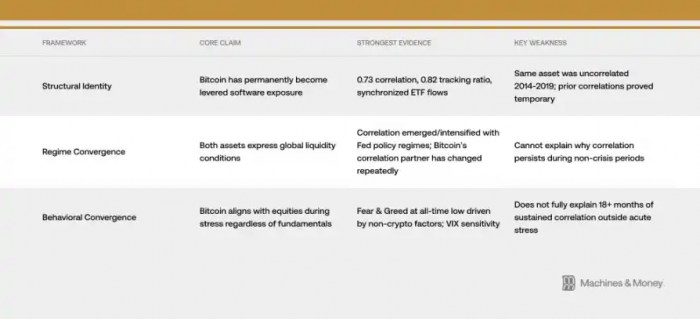 这种观点认为,比特币已经被永久地重新定义了。证据就是上面说的那些:和软件股高达 0.73 的相关性、几乎同步的涨跌、同步的 ETF 资金流动、共同的机构投资者。在这个框架下,ETF 时代把比特币塞进了科技股的投资组合里,永久性地改变了它的风险属性。这种相关性会持续下去,不管市场周期怎么变。