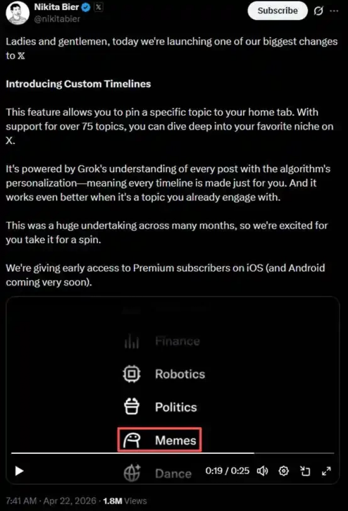 4 月 22 日,X 产品负责人兼 Solana 顾问 Nikita Bier 今晨发布 X 新功能「自定义时间线」,该功能允许用户将特定主题固定在主页标签页,并支持超过 75 个兴趣主题,帮助用户深入浏览细分内容领域。在其宣传视频中,meme 主题版块以 Flork 形象为 logo。