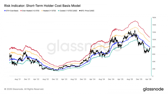 突破真实市场均值后,市场现在面临下一个更为严峻的考验。短期持有者成本基础 8.01 万美元代表过去 155 天内买入投资者的平均买入价格,这一群体历史上被证明是市场中最具价格敏感性的群体。