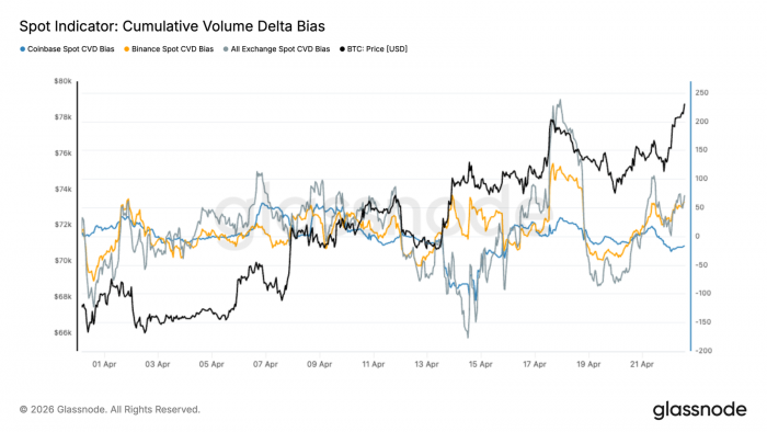交易所层面的动态显示表面下存在一定分化。币安现货 CVD 主导了近期的买入压力,而 Coinbase 的活动相对低迷,指向离岸或零售驱动流动的更强参与。然而,所有交易所的总体 CVD 趋势已转为正值,强化了买家正带着信念入场的观点。