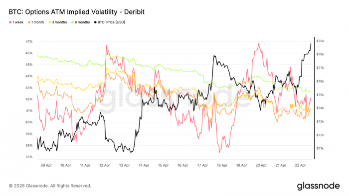 比特币 30 天已实现波动率目前为 40.7%,较 4 月初的 49% 下降,价格行动保持收敛且跟进力度有限。这很重要,因为已实现波动率锚定了期权应如何定价。当已实现波动率保持低位时,隐含波动率就很难维持任何上行,因为底层没有压力来证明更高溢价的合理性。